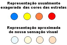 Isso não significa que as estrelas não apresentam as cores listadas nos textos de Astronomia. Elas são coloridas, sim, mas suas cores não são intensas como as das ilustrações porque elas não são cores “puras”. Além disso, a definição quantitativa das cores não representa a nossa percepção fisiológica.